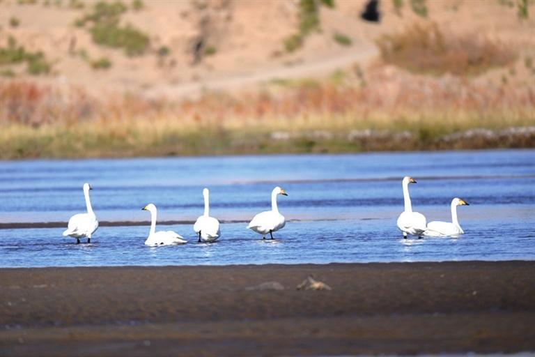 近日,高臺縣黑河濕地多次監(jiān)測到大天鵝種群,它們的翩翩降臨,標志著天鵝一年一度的越冬之旅正式開啟。 大天鵝是雁形目鴨科天鵝屬鳥類,又稱黃嘴天鵝,全身潔白,僅頭稍沾棕黃色;喙黑色,上喙基部黃色,喙端黑色;跗跖、蹼、爪也為黑色,是國家二級保護動物。天鵝對棲息地的選擇極為苛刻,它們的到來是高臺縣黑河濕地生態(tài)環(huán)境質(zhì)量優(yōu)良的有力證明。