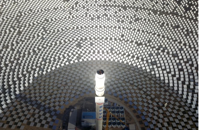 人們驚呼,這是自然力與人類智慧的完美創(chuàng)造:戈壁荒灘上“種”出了人造太陽。這個(gè)100兆瓦熔鹽塔式光熱電站,占地面積相當(dāng)于780個(gè)足球場,每年所生產(chǎn)的綠電可減排35萬噸二氧化碳。