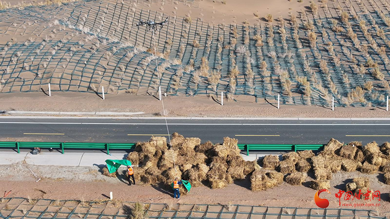 防沙治沙又一季,綠化造林年復(fù)年。這幾天,在金塔縣城至大墩門公路“三北”工程防沙治沙現(xiàn)場,一捆捆稻草正排著隊(duì)乘坐無人機(jī)前往沙漠深處。走進(jìn)壓沙現(xiàn)場,大家拉草埋沙,手提肩扛,或俯身鋪草,或揮鍬壓埋、填沙整型,分工明確、干勁十足。一臺壓沙車正在作業(yè),車輪駛過,稻草沙障便被植入沙漠里,劃線、鋪草、壓草,整個流程一氣呵成,效率大大提高。