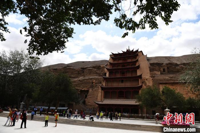 圖為游客在莫高窟九層樓前合影留念。(資料圖) 楊艷敏 攝