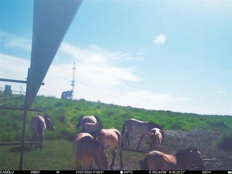 近日,甘肅敦煌西湖國家級自然保護區(qū)管護中心工作人員整理紅外相機拍攝畫面時,發(fā)現(xiàn)拍攝到普氏野馬“哺乳”的清晰影像。畫面拍攝于今年7月下旬,有8匹普氏野馬繁殖群正在馬圈灣濕地的飲水泉附近活動,其中有一匹小馬駒滿足地吸吮著母馬的乳汁。據(jù)監(jiān)測,該小馬駒出生于6月上旬,畫面中約已有一個半月大小,身體健康,毛色光亮。這個繁殖群領(lǐng)地范圍主要從馬圈灣西觀景臺至馬圈灣東高地,該區(qū)域可采食物種類豐富、水源充沛,是適合普氏野馬生活的美麗家園。普氏野馬是國家一級重點保護動物,常棲息于山地、草原和荒漠,性機警、善奔跑。近年來,隨著敦煌西湖保護區(qū)生態(tài)環(huán)境保護力度加大,生態(tài)環(huán)境質(zhì)量持續(xù)改善,群眾保護野生動植物的意識不斷增強,使野生動物活動范圍不斷擴大,種群數(shù)量不斷增加。截至目前,敦煌西湖保護區(qū)內(nèi)普氏野馬種群數(shù)量已達166匹。