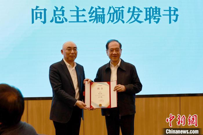 上海世紀出版集團黨委副書記、總裁闞寧輝向韓啟德總主編頒發(fā)聘書?!∩倌陜和霭嫔?nbsp;供圖