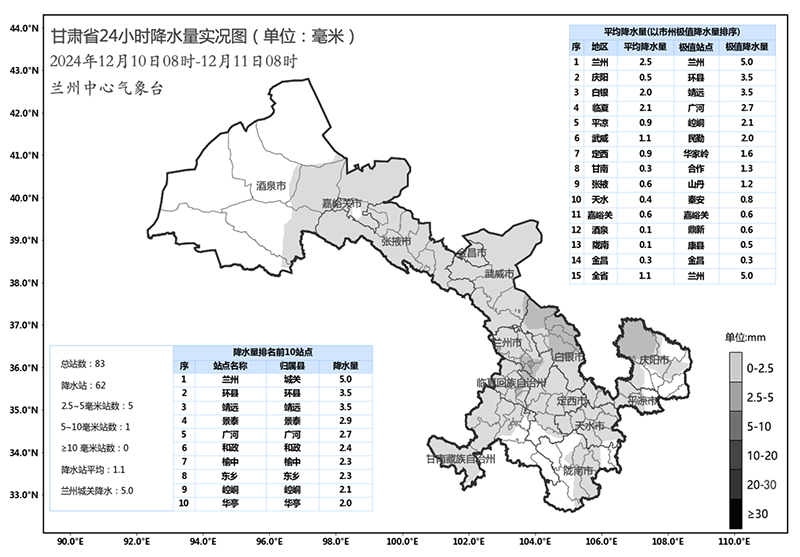中國(guó)甘肅網(wǎng)12月11日訊(西北角·中國(guó)甘肅網(wǎng)記者 沈文剛)12月10日8時(shí)至12月11日8時(shí),全省共計(jì)62個(gè)縣區(qū)出現(xiàn)小雪,其中蘭州主城區(qū)出現(xiàn)大雪,慶陽北部、白銀中部和北部、臨夏西南部出現(xiàn)中雪。較大降水量出現(xiàn)在蘭州本站5.0mm、靖遠(yuǎn)3.5mm、環(huán)縣3.5mm、景泰2.9mm、廣河2.7mm。