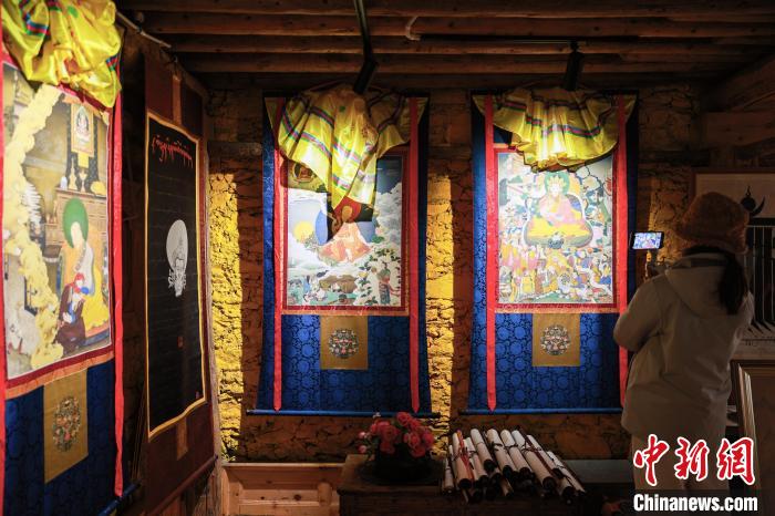 12月22日,一位游客拍攝展示的唐卡。中新社記者 薛蒂 攝