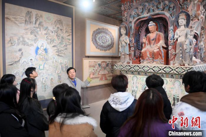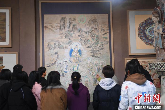 1月14日,甘肅省酒泉市,甘肅酒泉職業(yè)技術(shù)學院非物質(zhì)文化遺產(chǎn)敦煌彩塑技藝傳習所內(nèi),學生們參觀敦煌壁畫作品。中新社記者 李亞龍 攝