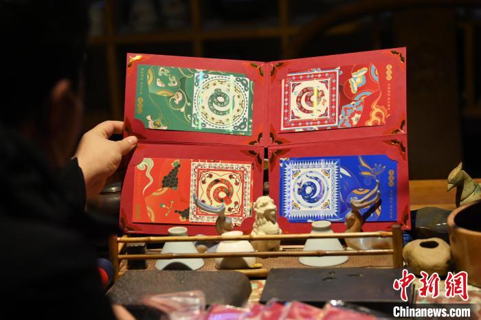 1月10日,在甘肅省敦煌市敦煌畫院內(nèi),游人參觀由敦煌畫院設(shè)計(jì)授權(quán)的中國(guó)郵政《敦煌福蛇》極限型明信片。中國(guó)郵政《敦煌福蛇》極限型明信片從敦煌壁畫里的藻井汲取靈感,集合敦煌紋樣、民藝剪紙等中國(guó)傳統(tǒng)藝術(shù)內(nèi)容,以春萌蛇、夏長(zhǎng)蛇、秋實(shí)蛇、冬藏蛇對(duì)應(yīng)著四季祝福。中新社記者 李亞龍 攝