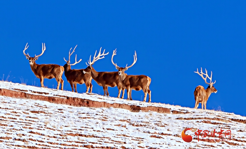 畫面顯示,在白雪皚皚的祁連山之上,五只白唇鹿駐足停留,仿佛也在欣賞祁連山美景,這些白唇鹿體態(tài)壯碩、動(dòng)作靈活,在鹿群“首領(lǐng)”的帶領(lǐng)下越過(guò)山坡,前往下一個(gè)覓食地。