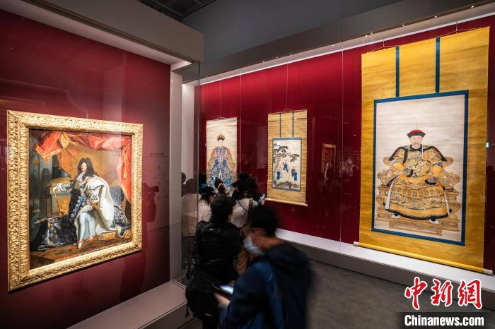 圖為故宮博物院藏《雍正帝朝服像》《康熙帝戎裝像》《孝莊文皇后朝服像》(右一起)和法國(guó)《路易十四肖像》(左一)同廳展示。中新網(wǎng)記者 侯宇 攝
