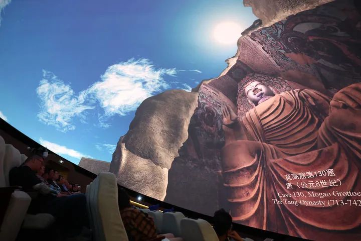 2024年9月4日,游客在莫高窟數(shù)字展示中心觀(guān)看球幕電影《夢(mèng)幻佛宮》。新華社記者 陳斌 攝