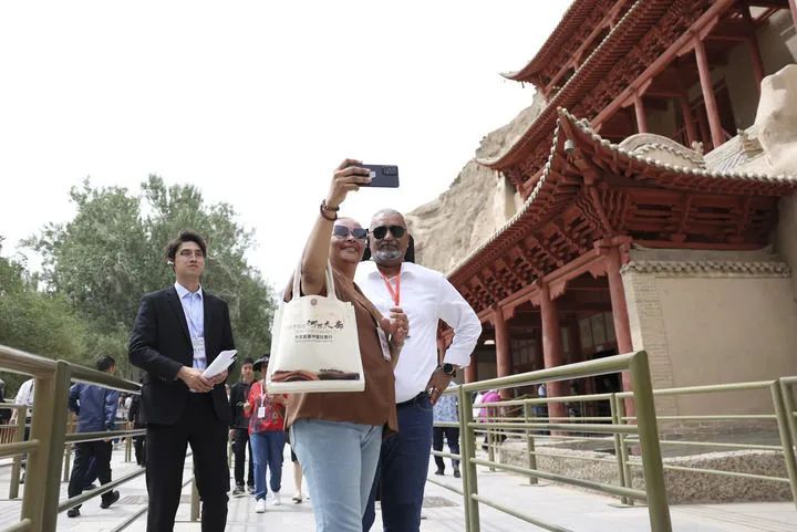 2024年6月7日,前來(lái)甘肅調(diào)研考察的駐華外交官在敦煌莫高窟九層樓前留影。新華社記者 陳斌 攝