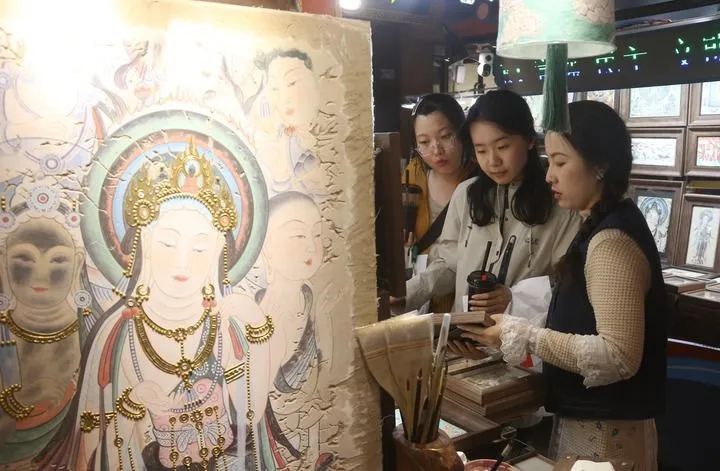 街道上,獨(dú)具特色的文化元素?zé)o處不在。民宿老板用改良的“三兔共耳”紋樣裝飾門(mén)楣,茶館的八棱柱竟是莫高窟中心塔柱的微縮版。最多的還是書(shū)店和文創(chuàng)店,一家挨著一家,紅柳根雕、敦煌樂(lè)器、創(chuàng)意工美、飛天泥版畫(huà)琳瑯滿(mǎn)目。