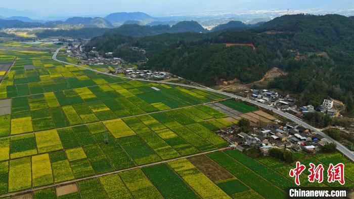 近日,云南省騰沖市界頭鎮(zhèn)成片的油菜花盛開(kāi),吸引不少游客前來(lái)觀光。金黃的油菜花海與遠(yuǎn)處白墻黛瓦的村落相映成趣,共同繪就一幅寫意的水墨畫。圖為油菜花田航拍。趙輝  攝