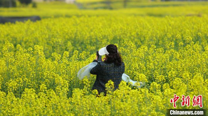 近日,云南省騰沖市界頭鎮(zhèn)成片的油菜花盛開(kāi),吸引不少游客前來(lái)觀光。金黃的油菜花海與遠(yuǎn)處白墻黛瓦的村落相映成趣,共同繪就一幅寫意的水墨畫。圖為游客拍攝油菜花田。趙輝  攝