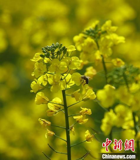 近日,云南省騰沖市界頭鎮(zhèn)成片的油菜花盛開(kāi),吸引不少游客前來(lái)觀光。金黃的油菜花海與遠(yuǎn)處白墻黛瓦的村落相映成趣,共同繪就一幅寫意的水墨畫。圖為油菜花吸引蜜蜂采蜜。趙輝  攝