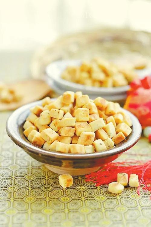 做面棋子,先和面。面里最好加豬油、雞蛋,攪拌均勻,加水,再揉,揉好面,搟開(kāi)。不能太薄,也不能太厚,約半本語(yǔ)文書(shū)那般寬度即可。然后切,切成菱形,拇指大小,撒面,一拌,以防粘連。麥草燒鍋,鍋熱,放油。油熱,冒微煙,把面棋子放進(jìn)鍋,反復(fù)翻炒,直到微黃。炒熟后,熄火,不蓋鍋蓋,再到鍋里“焙”(烤的意思)一陣,直到用勺子舀起,又倒下去,鐵鍋里叮當(dāng)有聲即可。