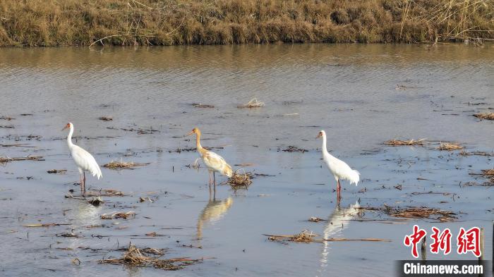 地處洞庭腹地的舵桿洲上,白鶴時(shí)而梳理羽毛,時(shí)而低頭覓食。 高宏 攝