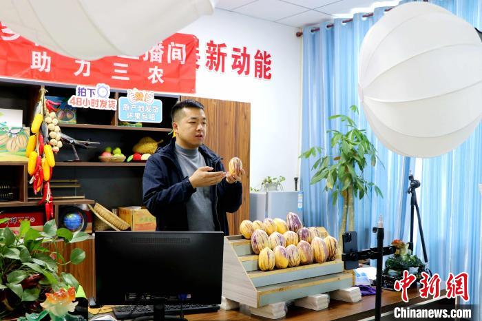 3月12日晚,甘肅省武威市民勤縣“95后”小伙張煜文用直播電商銷售人參果。馬愛彬 攝