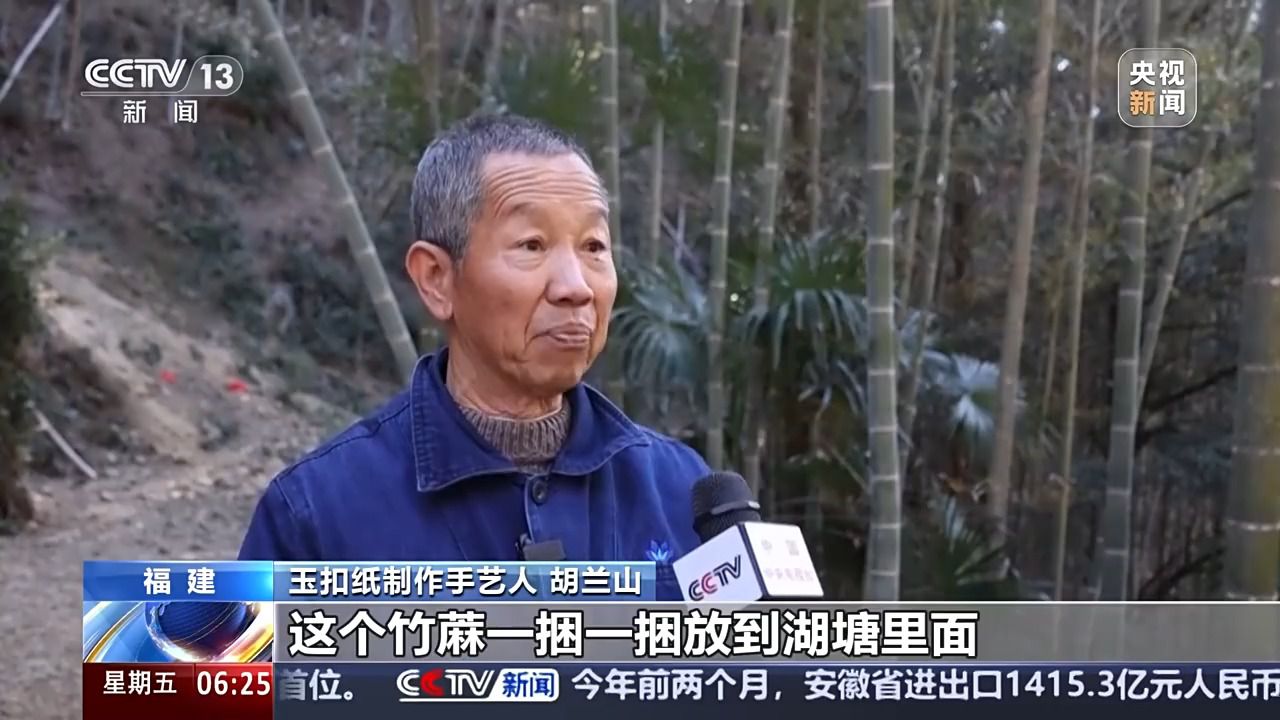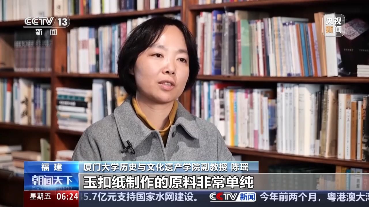 廈門大學(xué)歷史與文化遺產(chǎn)學(xué)院副教授 陳瑤:玉扣紙制作的原料非常單純。就是三種,一個(gè)是竹子嫩竹,第二個(gè)是石灰,第三個(gè)就是清潔的山泉水?;旧鲜羌兛咳斯磉M(jìn)行品質(zhì)的管控。