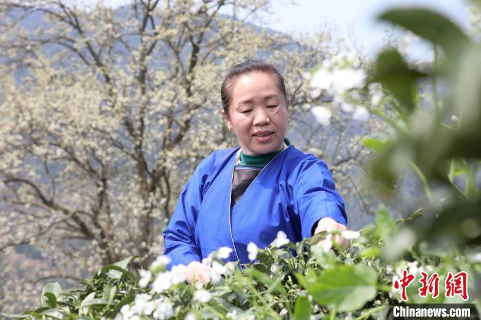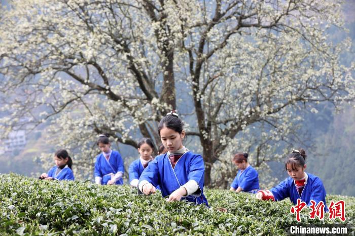 3月16日,廣西三江侗族自治縣八江鎮(zhèn)歸令村六更屯種植的千樹梨花迎春綻放,與青翠茶園、特色民居相映成趣,構(gòu)成一幅如詩如畫的春日畫卷。當(dāng)?shù)卮迕窦坝慰图娂娗皝聿刹栀p花、“打卡”拍照,享受春日美好時(shí)光。圖為村民在采春茶。龔普康 攝