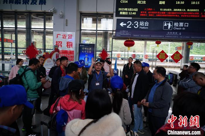 3月16日,云南省紅河州河口縣河口北站,一位導(dǎo)游組織越南旅游團候車。中新社記者  劉冉陽  攝