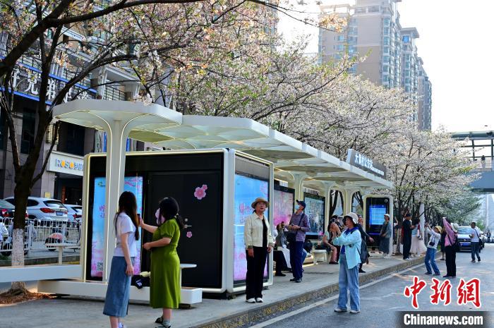 圖為市民游客在珞喻東路大黃村公交站候車(chē)、拍照。劉康 攝