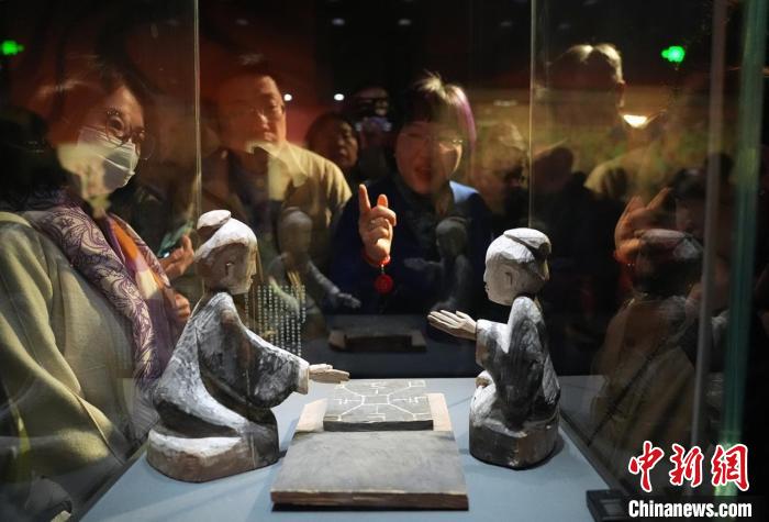 3月30日,觀眾在講解員的引導(dǎo)下欣賞甘肅省博物館藏的西漢彩繪木六博俑?!∈反宏枖z