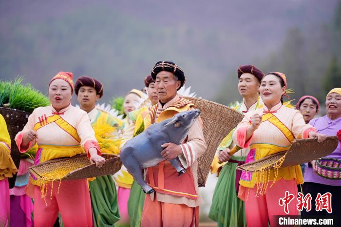 依托黎壩鎮(zhèn)層疊梯田的天然弧度與蒼翠山谷的立體聲場,該劇將鎮(zhèn)巴民歌、陜南民俗等非遺元素融入山水實景。春之序曲《山歌迎賓》中,油菜花海間百人山歌陣,以原生態(tài)多聲部民歌編織迎賓盛景;夏之華章《綠的交響》里,非遺薅草鑼鼓與現(xiàn)代音樂碰撞出農(nóng)耕文明的力與美;秋之禮贊《金的節(jié)奏》在陽光下呈現(xiàn)打連枷聲浪與稻浪共舞的豐收奇景;冬之情書《紅的濃情》則通過圍爐陜南說唱,在吊爐光影間訴說巴山兒女的熾熱情懷。
