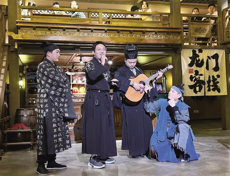 “諸位小友近來可好?”“好!”在街區(qū),NPC們與游客的互動(dòng)成為一大亮點(diǎn)。為了讓游客更好地沉浸其中,街區(qū)里的“蘭裳閣”專門提供服裝出租和妝造設(shè)計(jì)服務(wù)。游客們?cè)谶@里換上漢服、做好造型,“穿越”成古人與NPC們共同沉浸在這場(chǎng)歷史旅行中。張偉彥在“龍門客棧”工作快半年了,飾演店小二馬一刀。他對(duì)角色有著自己的理解:“導(dǎo)演讓我演店小二,大家印象里店小二都是機(jī)靈、腿腳快的。但我演的這個(gè)店小二帶著江湖氣息,他藏在龍門客棧,其實(shí)是個(gè)刀客,在這里打工是為了打探消息,畢竟龍門客棧可是江湖消息的聚集地。”記者走在街區(qū),時(shí)不時(shí)就能看到他拿著草帽,熱情地招呼游客玩接帽子游戲。遇到靦腆不敢嘗試的游客,他也會(huì)不斷鼓勵(lì),有時(shí)候碰上外國游客,他還隨口說幾句英語與其互動(dòng)。
