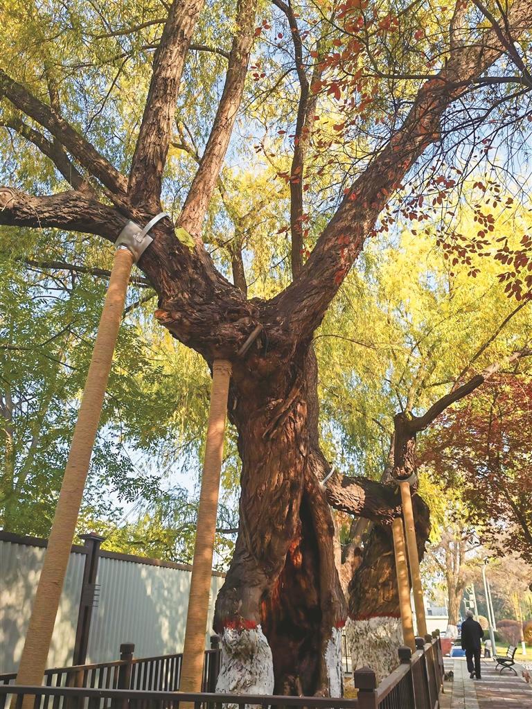 行至平沙落雁,路旁綠草之上,一株百年文冠果樹(shù)上果實(shí)累累,宛如哨兵般靜靜守候,為熱鬧的街市增添了幾分寧?kù)o。在綠色公園內(nèi),一株700年樹(shù)齡的古國(guó)槐枝繁葉茂。復(fù)古的支架穩(wěn)穩(wěn)支撐著枝干,既確保它在歲月中安然生長(zhǎng),又透出滄桑之感。花崗巖圍欄環(huán)繞四周,其上雕刻的荷葉荷花圖案栩栩如生,“愛(ài)護(hù)樹(shù)木”“保護(hù)生態(tài)”等文字清晰可見(jiàn),無(wú)聲地倡導(dǎo)著人們保護(hù)環(huán)境、愛(ài)護(hù)植物。退休教師王淑芬正帶著小孫女玩耍,她笑著說(shuō):“這兒空氣好,景色美,每天帶孩子來(lái)親近古樹(shù),也是在給她種下愛(ài)護(hù)自然的種子。”游客的歡笑聲、孩童的嬉戲聲與清脆的鳥(niǎo)鳴聲交織在一起,為古樹(shù)增添了別樣的活力。
