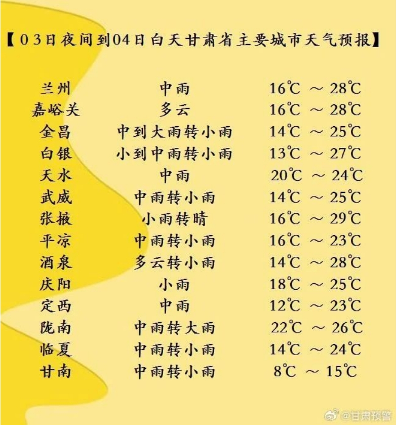 明天夜間到后天白天(7月4日20時-7月5日20時),河西五市多云轉陰,局部地方有小雨或陣雨;省內(nèi)其余地方陰有小雨或陣雨,其中,白銀、定西、甘南、隴南等市州局部地方有中雨。