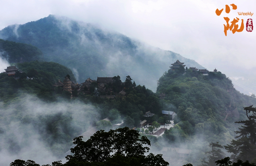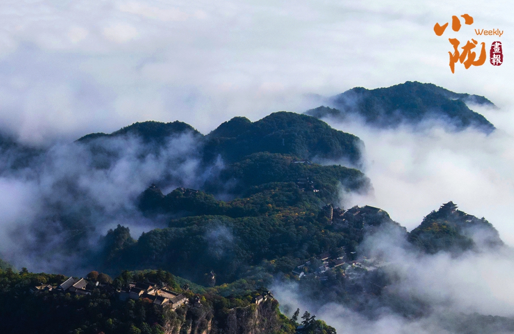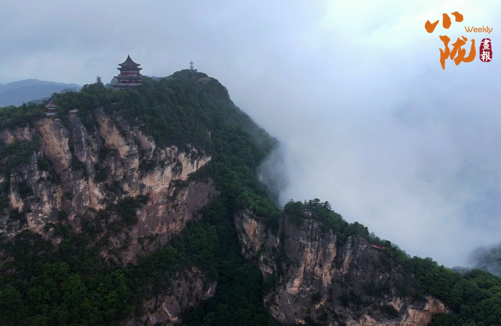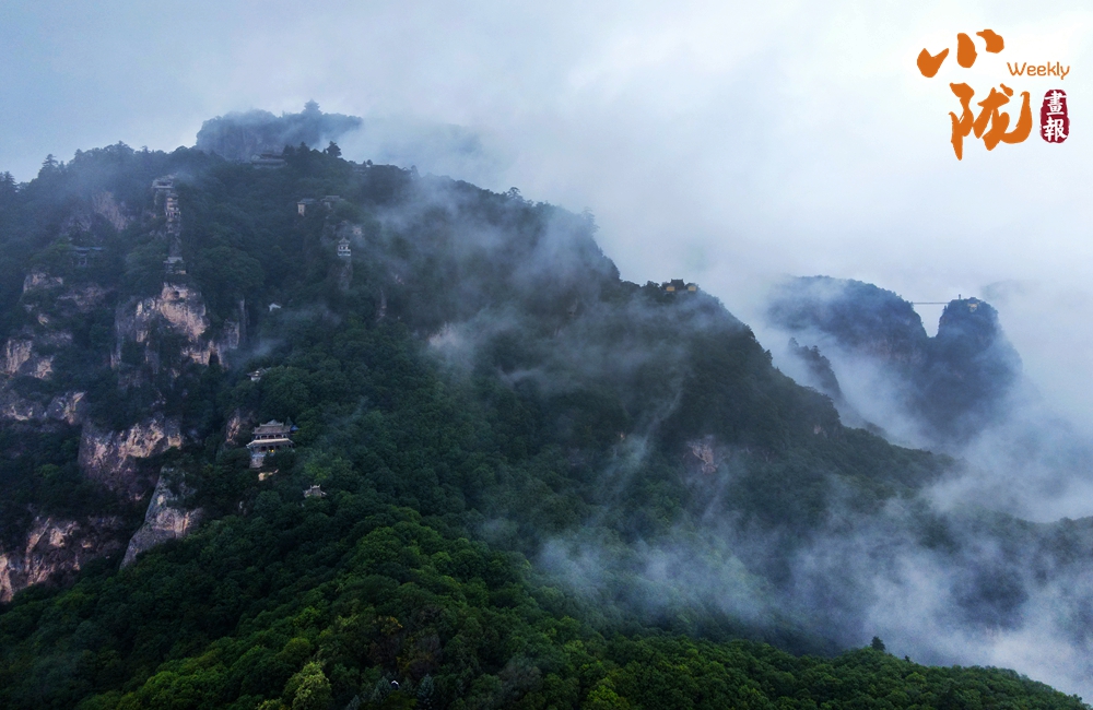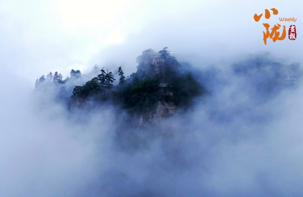 云霧繚繞,山水與寺廟隱現,營造出神秘且令人向往的視覺效果。站在半山腰,背靠懸崖,深邃不可見底,不禁生出“山登絕頂我為峰”的豪情。然而,世間萬物,瞬息萬變,是否成為峰巔之巔又何妨?