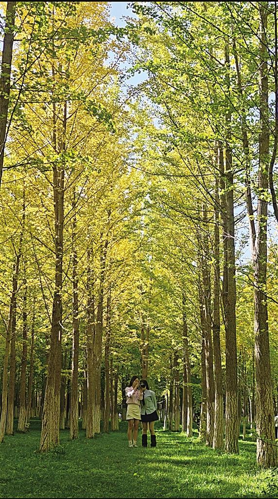 初秋時分,市民在銀杏樹下拍照打卡