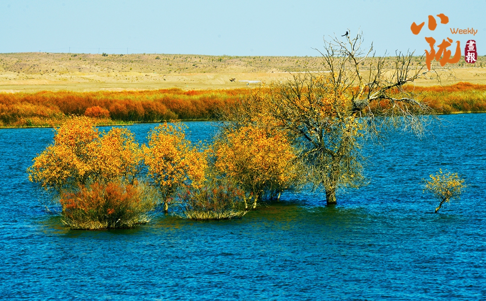 天藍藍,水藍藍,水天一色。紅柳簇擁成焰,燃燒在水中央,顯得格外奪目,展現(xiàn)出荒漠特有的壯美與生機。
