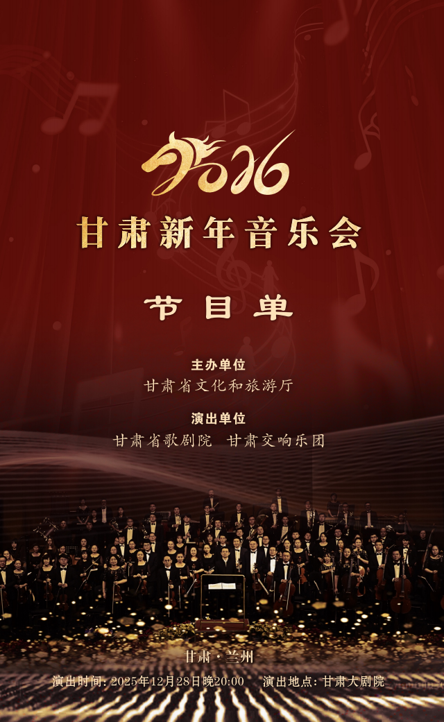中國甘肅網(wǎng)12月24日訊(西北角·中國甘肅網(wǎng)記者 任磊)2026甘肅新年音樂會將于12月28日晚在甘肅大劇院奏響。本場音樂會由甘肅省文化和旅游廳主辦,甘肅省歌劇院、甘肅交響樂團(tuán)承辦,將以一場中西合璧、氣勢恢宏的交響盛宴,為金城觀眾獻(xiàn)上誠意滿滿的新年祝福。