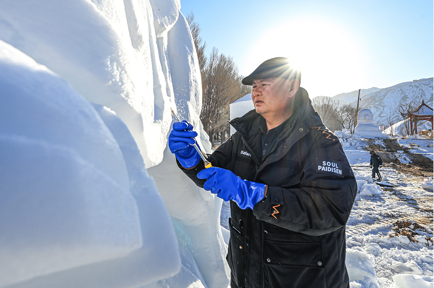 中國甘肅網(wǎng)1月13日訊 據(jù)嘉峪關(guān)日報報道(融媒體中心記者 李巍 攝)揚鏟塑造型,落刀雕精彩。1月10日,懸壁長城腳下,《昭君出塞》《九尾靈狐》《喜財神》等雪雕作品,在匠人們的精雕細琢中漸漸揭開“面紗”。