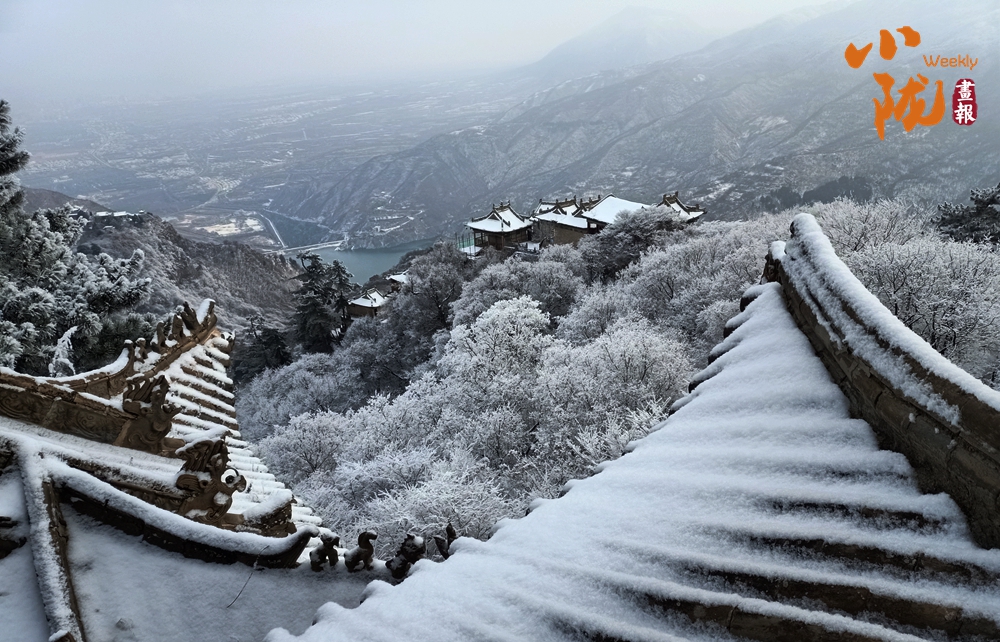 群山裹素,起伏的線條在極致湛藍(lán)的天穹下舒展,積雪壓彎枝頭,形成道道玉弧。而點(diǎn)綴其間的廟宇樓閣,默然佇立,飛檐上的殘雪泛著微光,與這片寧?kù)o的藍(lán)白色調(diào)共同構(gòu)成一幅和諧、安詳?shù)男麓貉┚啊?/p>
