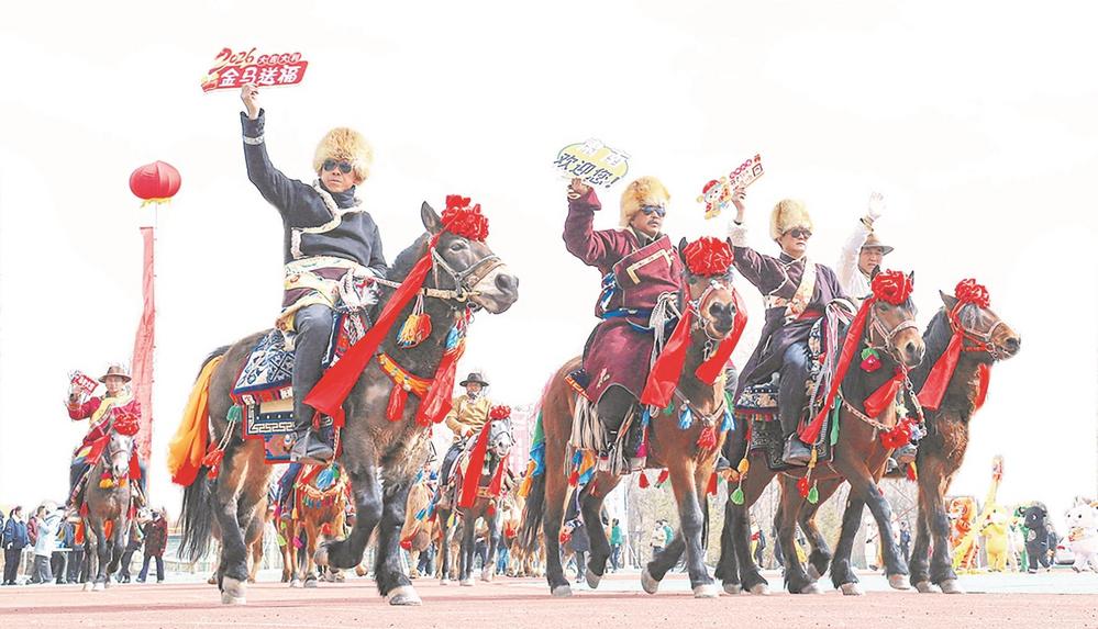 2月25日,肅南裕固族自治縣少數(shù)民族傳統(tǒng)項(xiàng)目體驗(yàn)區(qū)內(nèi),社火表演隊(duì)的隊(duì)員們?yōu)楦髯迦罕姾陀慰捅硌菸璧浮侗枷蛭磥?lái)》。 王將 鄧亞萍 攝