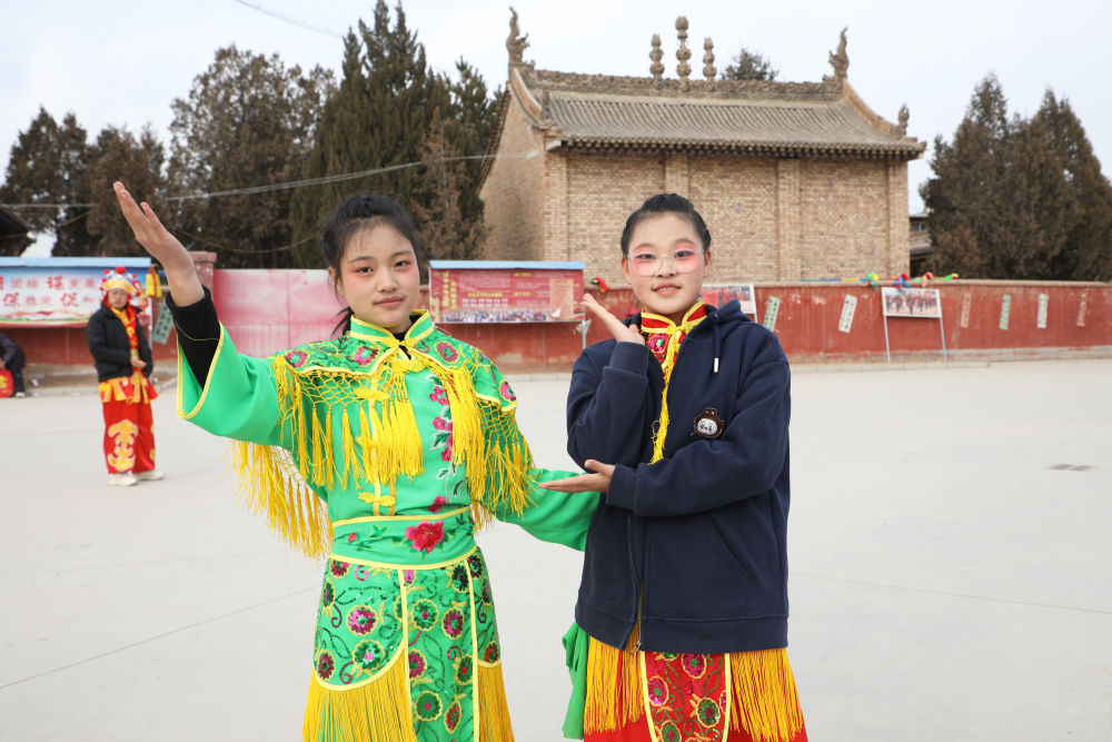 2月14日,在甘肅省蘭州市榆中縣,王欣怡(右一)、王欣語(右二)在社火表演排練間隙合影。新華社記者 張智敏 攝