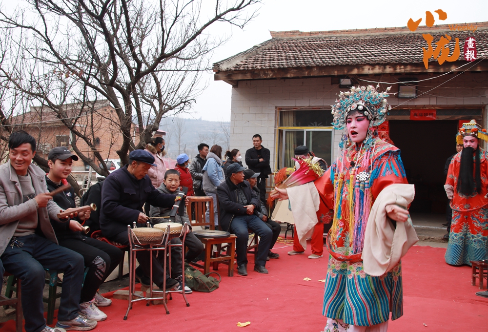 身著華麗戲服、頭戴精致鳳冠的演員在紅毯舞臺中央唱念做打,一旁的伴奏人員敲鑼打鼓、拉弦調(diào)音,為表演伴奏。臺下村民圍坐觀看,沉浸在悠揚的唱腔與熱鬧的鑼鼓聲里,古樸的民居、熱鬧的氛圍,盡顯這項非遺民俗的獨特魅力。