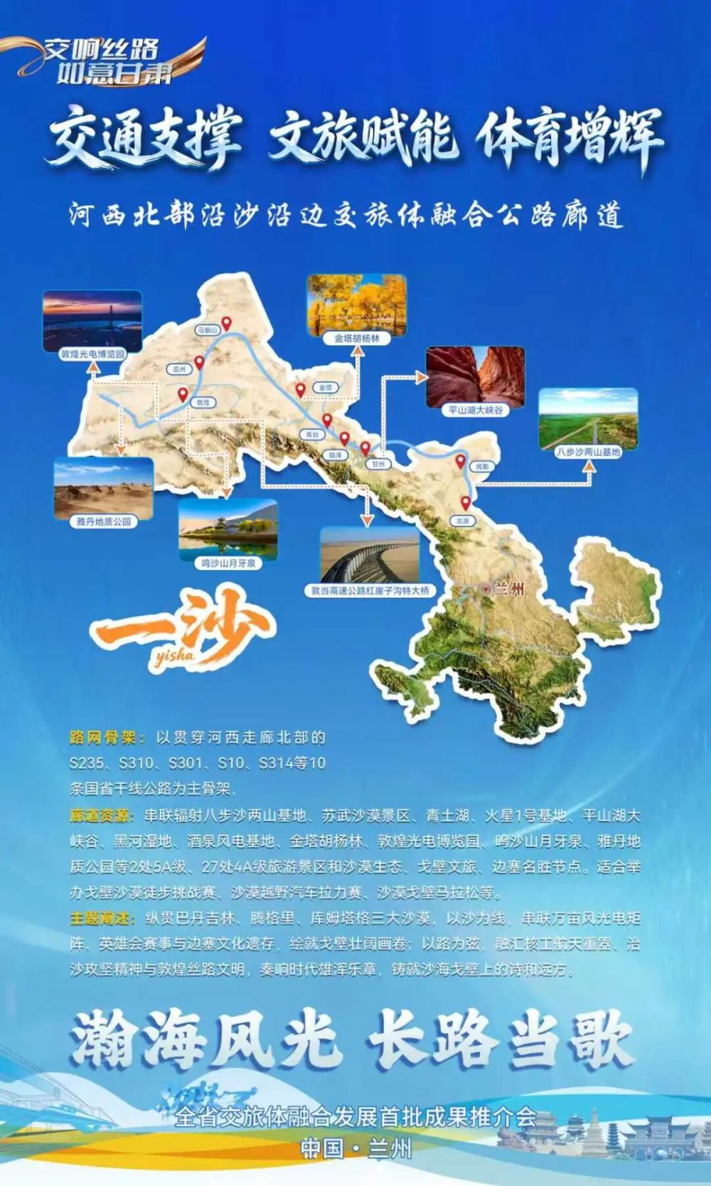 以“瀚海風(fēng)光?長(zhǎng)路當(dāng)歌”為主題,打造河西北部沿沙沿邊交旅體融合廊道,即“一沙廊道”。