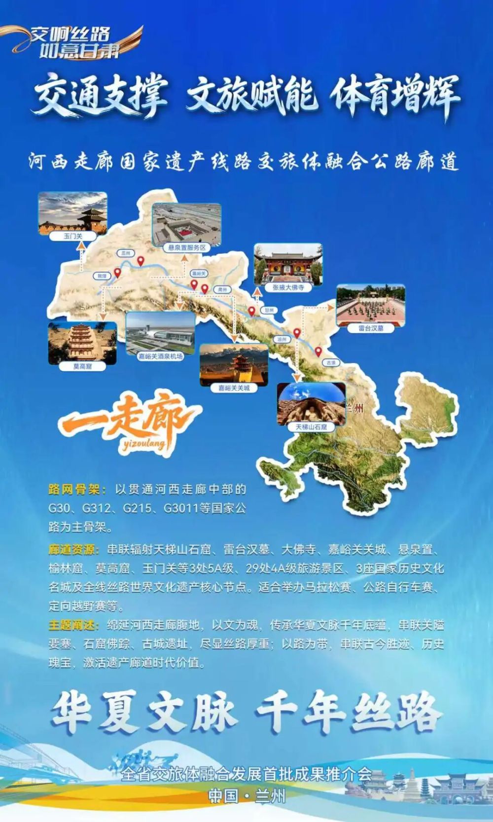以“華夏文脈 千年絲路”為主題,打造河西走廊國(guó)家遺產(chǎn)線路交旅體融合廊道,即“一走廊廊道”。