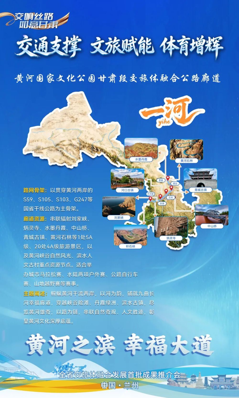 以“黃河之濱?幸福大道”為主題,打造黃河國(guó)家文化公園甘肅段交旅體融合廊道,即“一河廊道”。